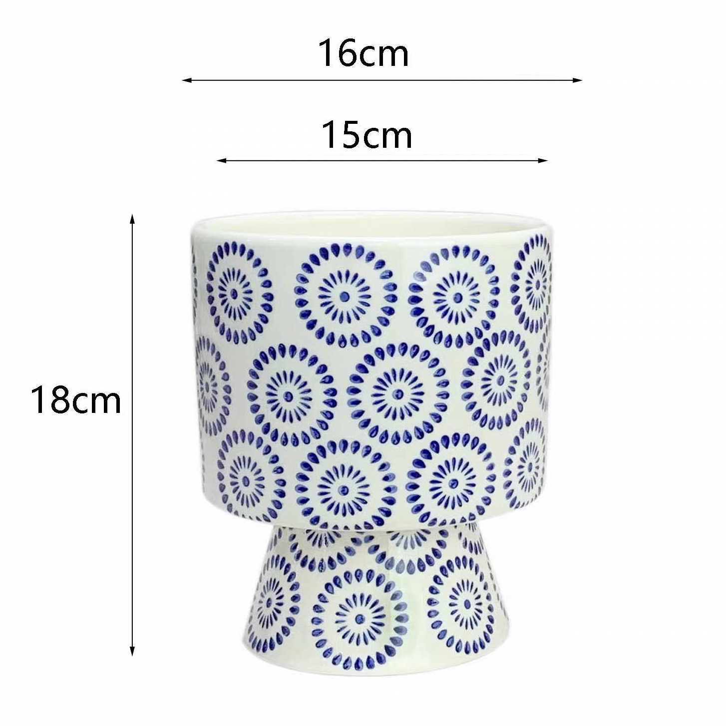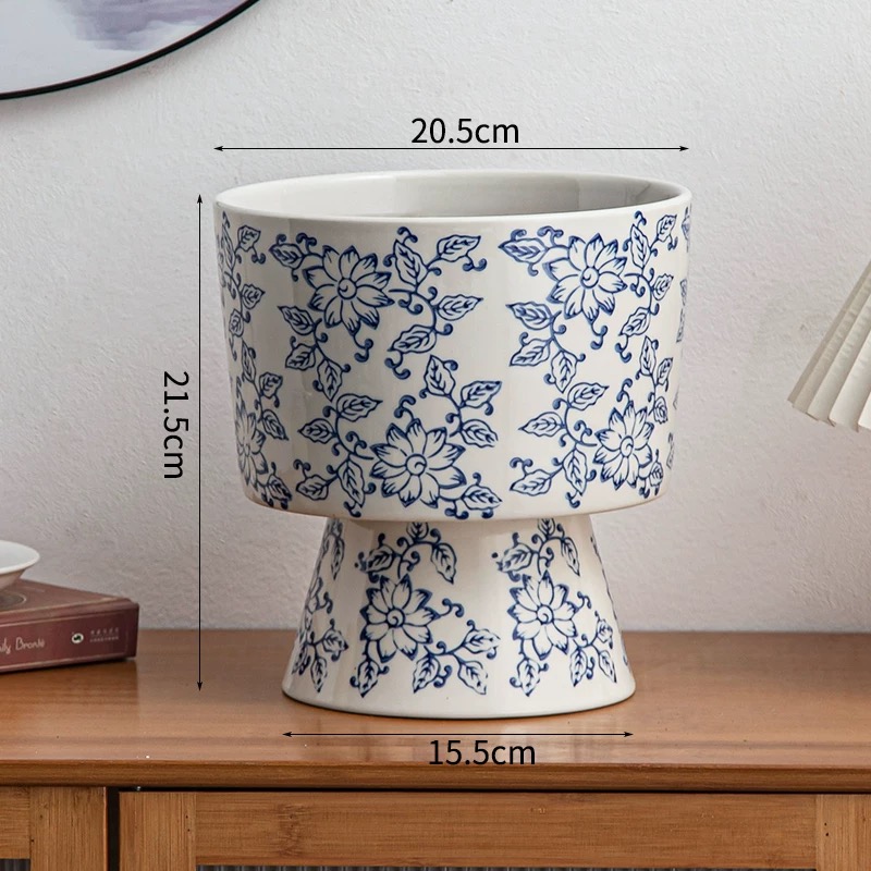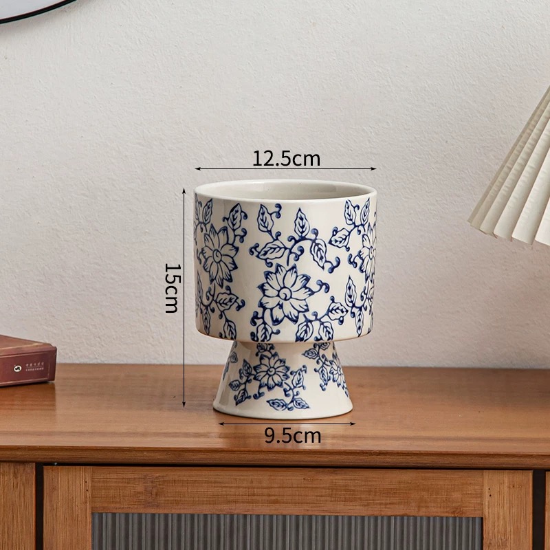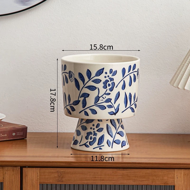 Chậu Lam Nhã mang vẻ đẹp truyền thống với họa tiết hoa văn xanh cobalt nổi bật trên nền sứ trắng ngà thanh lịch. Thiết kế dáng bầu tròn mềm mại kết hợp chân đế vững chắc, vừa sang trọng vừa đảm bảo độ ổn định khi trồng cây hoặc trưng bày trang trí.