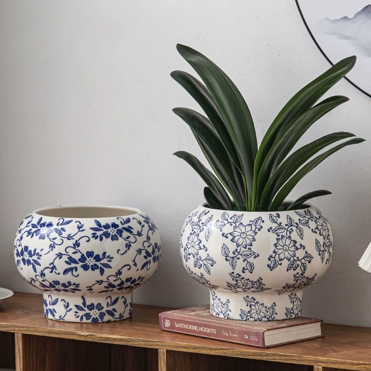 Chậu Lam Phúc mang vẻ đẹp truyền thống với họa tiết hoa văn xanh cobalt nổi bật trên nền sứ trắng ngà thanh lịch. Thiết kế dáng bầu tròn mềm mại kết hợp chân đế vững chắc, vừa sang trọng vừa đảm bảo độ ổn định khi trồng cây hoặc trưng bày trang trí.