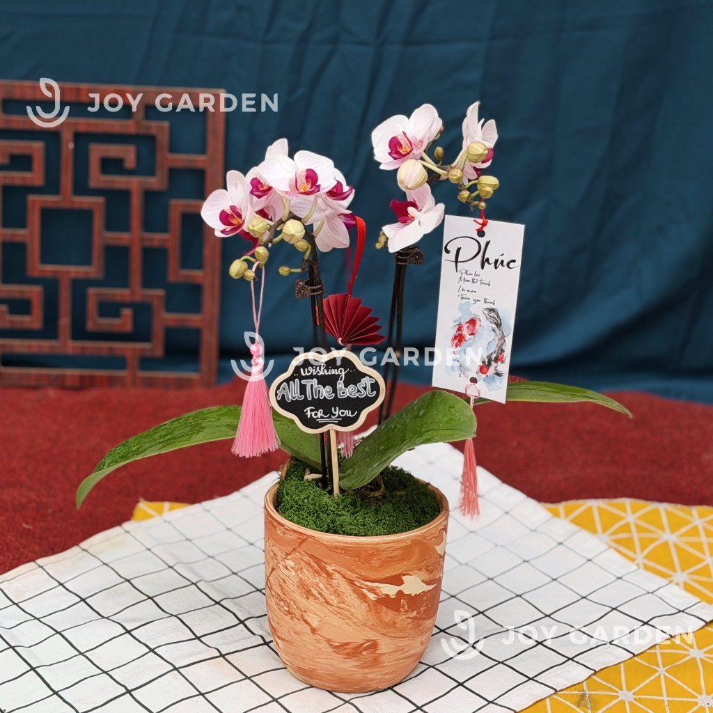 Chậu lan được phối từ những cành hồ điệp, hoa to, cánh dày, sắc cam pha hồng đỏ nhẹ nhàng độc đáo. Màu hoa vừa nổi bật vừa thanh lịch, hoa nở đều và bền lâu, tạo nên tổng thể sang trọng, hiện đại, phù hợp trưng bày tại phòng khách, bàn tiếp khách, quầy lễ tân hoặc cửa hàng.