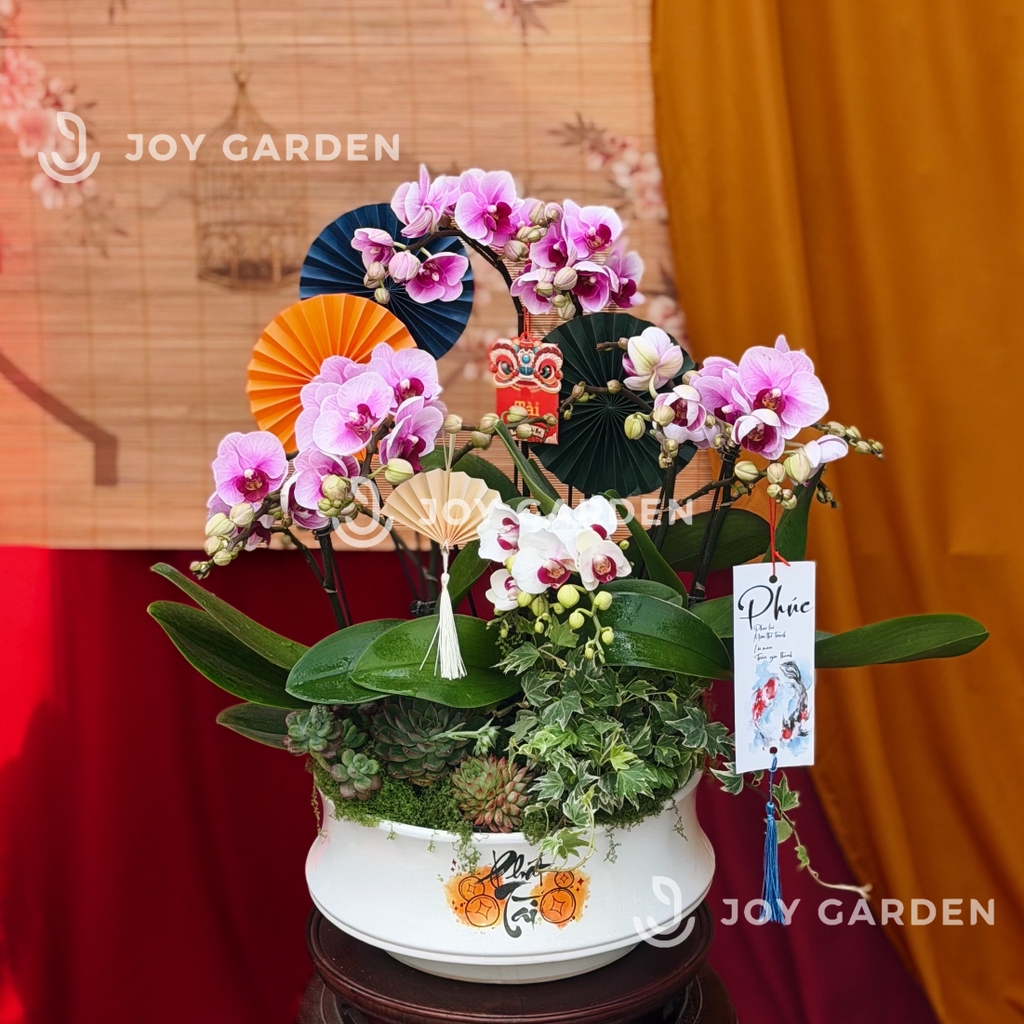Những cành lan được tuyển chọn kỹ lưỡng, hoa to, cánh dày, màu sắc tươi tắn, nở đều và bền lâu. Sự phối màu tím – trắng tượng trưng cho sự hòa hợp, may mắn và khởi đầu tốt đẹp, rất được ưa chuộng trong các dịp Tết, khai trương, tân gia, chúc mừng.
