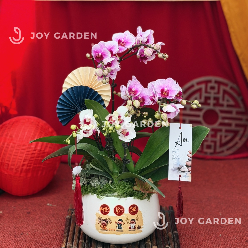 Những cành lan được tuyển chọn kỹ lưỡng, hoa to, cánh dày, màu sắc tươi tắn, nở đều và bền lâu. Sự phối màu tím – trắng tượng trưng cho sự hòa hợp, may mắn và khởi đầu tốt đẹp, rất được ưa chuộng trong các dịp Tết, khai trương, tân gia, chúc mừng.