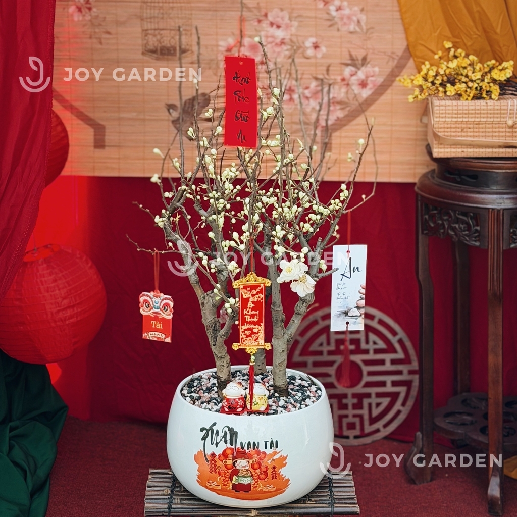 Chậu 3 cây mai trắng mang ý nghĩa Tam Phúc: Phúc – Lộc – Thọ, biểu trưng cho đầy đủ – vững bền – thịnh vượng. Thế cây hài hòa, tán đều, tạo cảm giác sung túc và viên mãn cho không gian ngày Tết, rất phù hợp trưng bày trong phòng khách, sảnh, cửa hàng hoặc không gian thờ.
